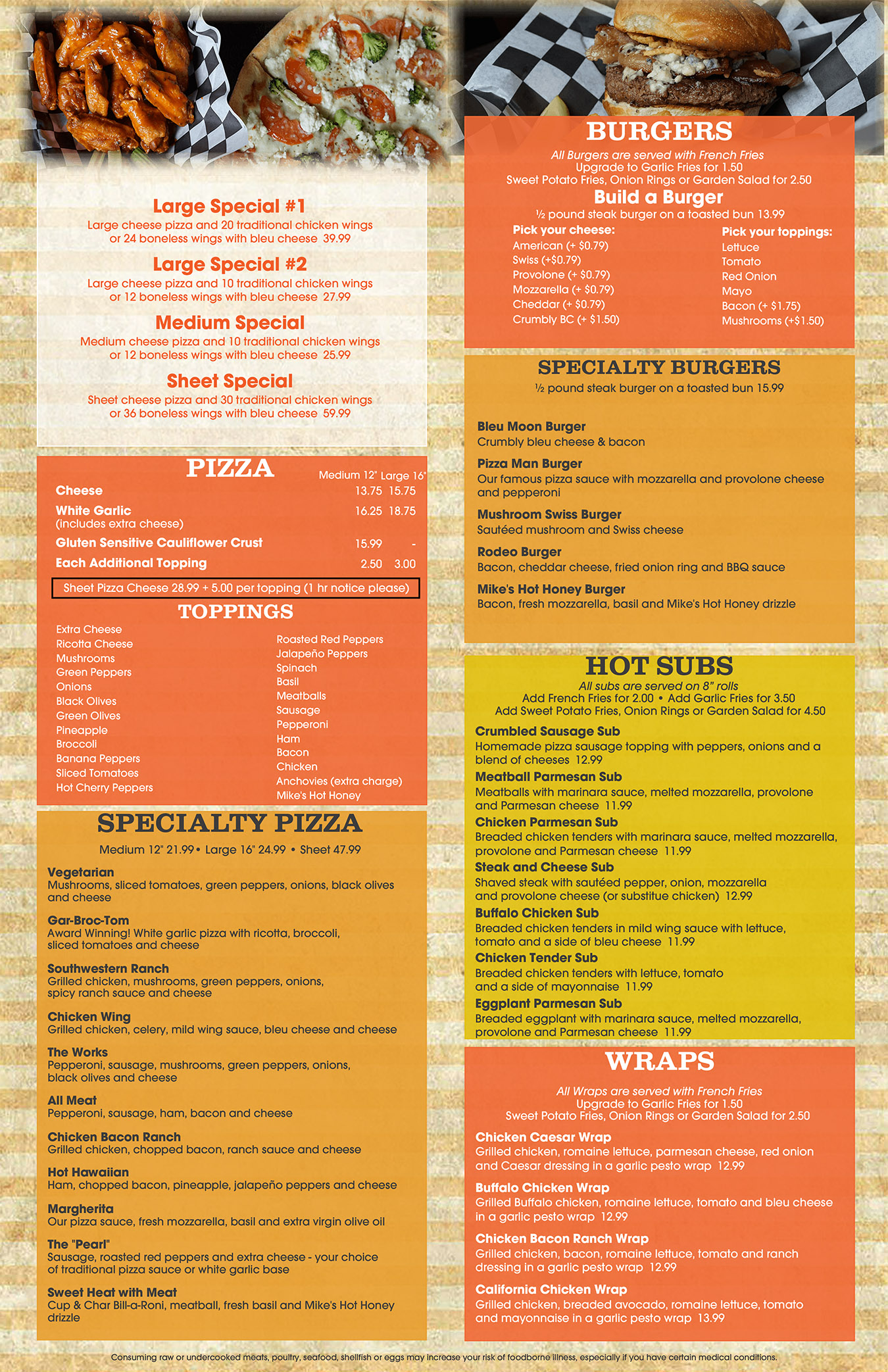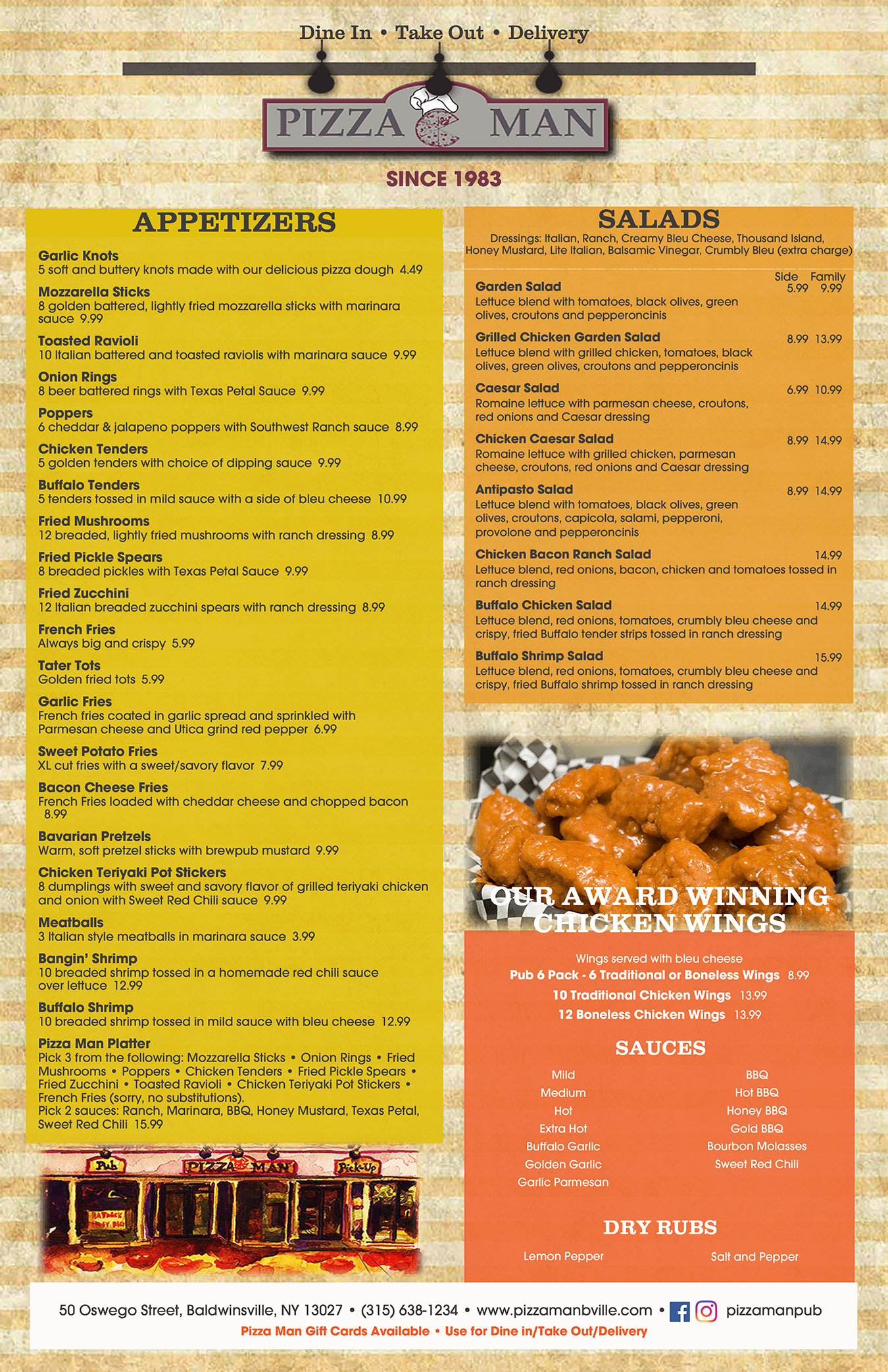 Pizza Man was established over 42 years ago in June of 1983 in Baldwinsville, NY. Since the beginning, we have been a true family business dedicated to serving a high-quality product. We use fresh ingredients and make our dough and sauce on premise daily. Our pizza and wings have won numerous awards at the annual Taste of Baldwinsville competition. In December of 2007, we expanded and opened a pub offering an expanded menu and seating for 60 people. The focal point of our Pub is a beautiful old-style mahogany bar which features 17 draught and over 30 bottled beers. The pub showcases some of the best live musical talent in Central New York most Saturday nights.